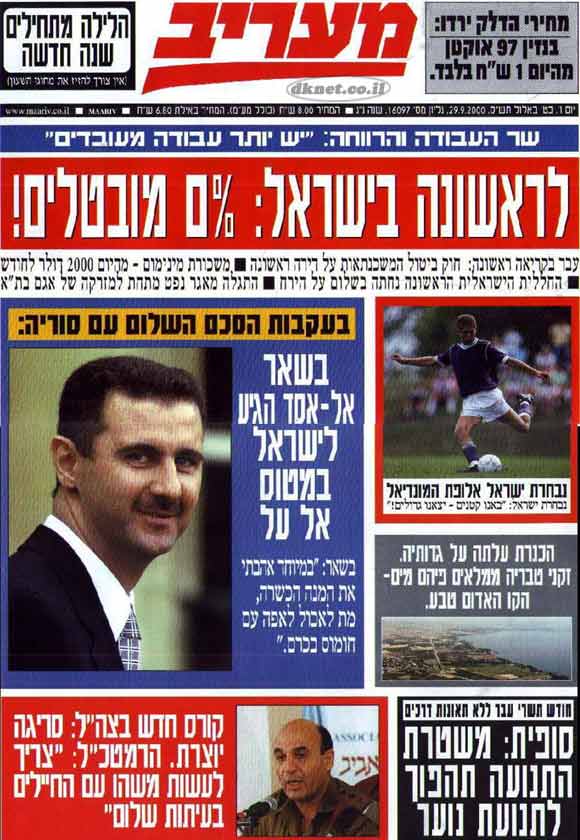 Сборная Израиля по футболу выиграла чемпионат мира. В связи с мирным договорм с Сирией президент Асад посетит Израиль, прбыв на самолёте авиакомпании "Эль-Аль"."